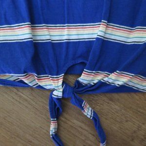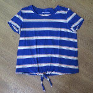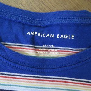 An adorable and excellent quality t-shirt from American Eagle. Blue with rainbow stripes. Knot at the front for an added touch. Excellent used condition with no visible damage. First image is not mine, I just borrowed it because it was lit better. Looks exactly the same. A little oversized.