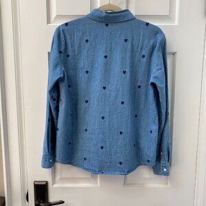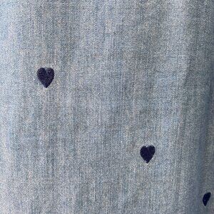 Cute denim top with blue on blue embroidered hearts and pearl white buttons. 100% cotton, in excellent used condition, no calls outs. Size small, 20" PTP, 25" length.