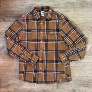 The North Face shirt, men’s plaid shirt, cotton button down, long sleeve collared shirt, light brown plaid, casual outdoor shirt, hiking shirt, camping shirt, men’s small shirt, flannel style, mid-weight cotton, rustic men’s fashion, fall layering piece, quality outdoor wear
