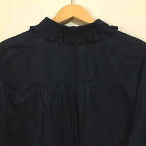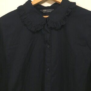 Very good preowned condition, dark navy blue, 100% cotton, balloon/peasant sleeve with ruched cuff, button down shirt by Marks & Spencers/M&S. Edwardian with a dash of cottagecore. Would look awesome with a vest.