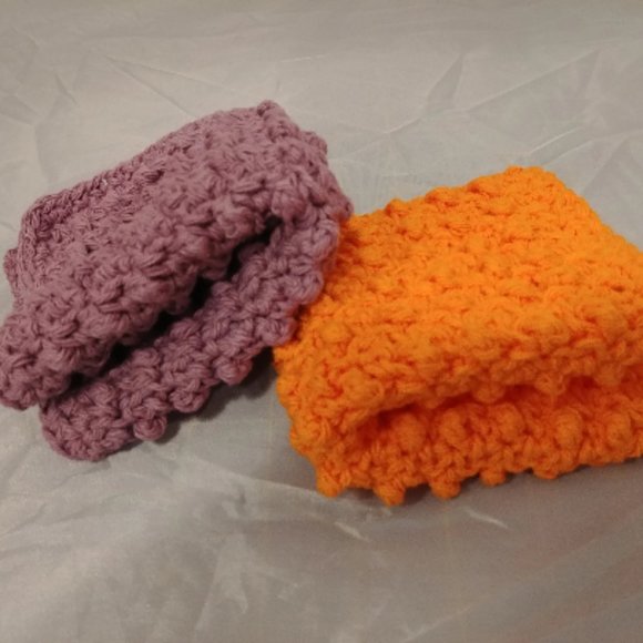 Mauve Purple and Orange handmade, crocheted cloths. The textured surface provides gentle exfoliation. Made from 100% cotton, they are also hypoallergenic and soft to the touch, before and after use. Look for other colours as well in my boutique.