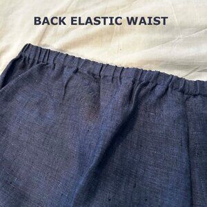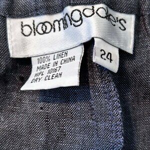 100% FINE LINEN PANTS, CHARCOAL BLUE, SIZE 24, HIDDEN FRONT FLY, TWO POCKETS, BACK ELASTIC WAIST, FRONT DRAWSTRING, BLOOMINGDALES, IN ORIGINAL BAG, WORN TWICE GENTLY