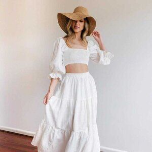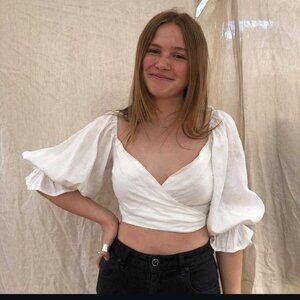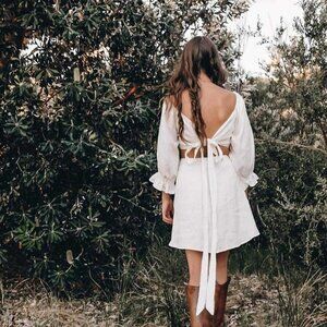 White 100% linen cottagecore-esque multi-way wrap top from Australian brand Aulieude. Romantic puff sleeves, elastic just below elbow. Has elastic panelled back that can be worn in the front. Long dangling beautiful ties that allow the top to be tied in the front or back. Super versatile piece, reminds me of items from Faithfull the Brand.