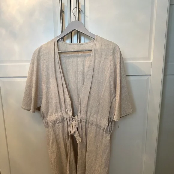 Natural Linen Color. Lightweight and cool. Butterfly sleeves with open underarm for coolness. Belt with guides so it won’t slip out. Tighten the wait as needed. One size. Made in Europe. 100% Flax Linen.