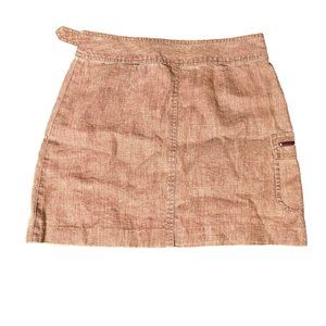 Lovely linen skirt with zipper closure, side pocket and built in belt. Excellent used condition. Waist 29-30" . Amazing cool fabric that allows your skin to breath on hot summer days. Study construction with fabric the feels and looks almost like a thin denim. The last two photos are the accurate depiction of the colour. A beautiful deep mauve.