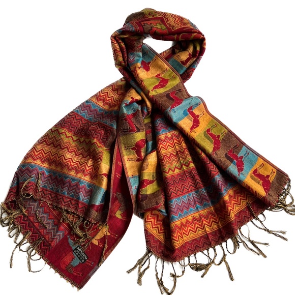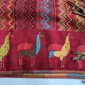 100% Pashmina SCARF Wrap LLamas Red Blue Gold Woven 26" x 67"