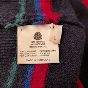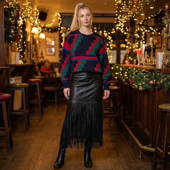 This cozy statement sweater comes from my personal wardrobe and is a beautiful example of classic Scottish knitwear. The sweater features a bold geometric pattern in deep navy, red, green, and blue tones. It is very warm with a dense knit, yet not heavy, making it comfortable and breathable. The oversized silhouette allows it to be styled effortlessly — wear it loose, belted, or layered with or instead of a scarf for extra warmth and a cozy, festive feel. Perfect for fall, winter, and cool spring evenings, this sweater adds instant comfort and a sense of hygge to any outfit.