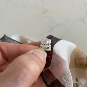 Features: 100% silk, abstract print, solid border, sheer, satin stripe, rolled edges, fall, casual or dressy