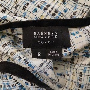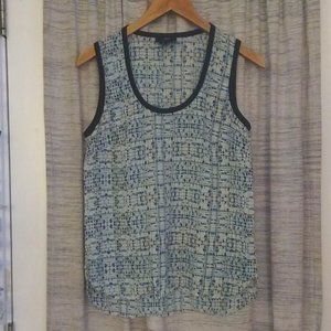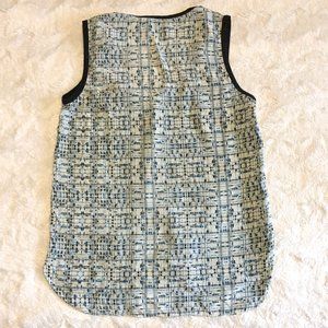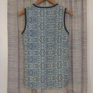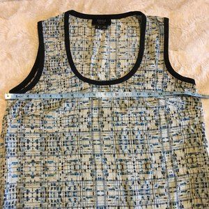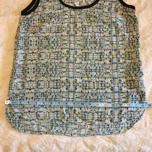 Excellent preowned condition, off-white geometric tank top with a black accent trim by luxury brand, Barneys New York CO-OP. Features an ochre/yellow, blue and black abstract pattern that kind of looks like the overhead view of a subway map. Lightweight and comfortable, modern and contemporary, this tank is the perfect career top through any season.