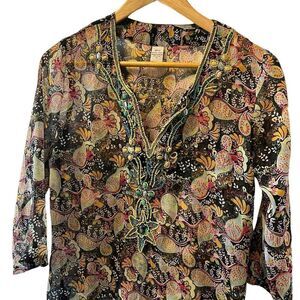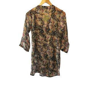 100% Silk Paisley Print Bead Embellished Semi Sheer Tunic Top S