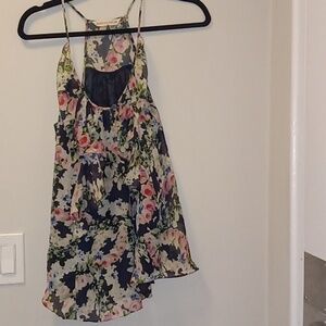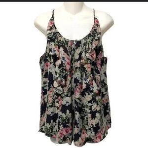 Beautiful 100% silk, with lining floral on black base tank top. Ruffle detail in front with small keyhole and button in the front.