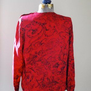 This Red Silk blouse can be dressed up or down and perfectly paired with a pair of black high waisted jeans or pencil skirt. It is long sleeved, collarless and has a beautiful cherub pattern. It is made of 100% vibrant red silk fabric and is fastened with three buttons on the left shoulder.