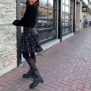 Sultry elegance defines this skirt cut from 100% pure silk with a floral print on black background. The skirt is lined and features all around beautifully curving panels for a gentle flare and displays a sense of dynamism with every movement.