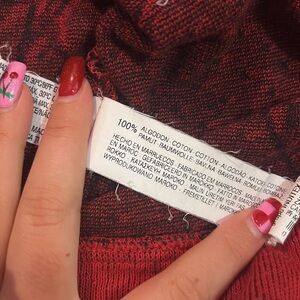 Stylish red cropped cardigan featuring a black bird print. Perfect for layering.