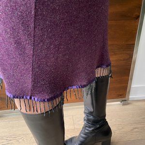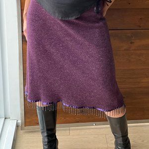 Fun and comfy 100 degree deep wine/purple skirt with beaded tassels. Elastic waist. 100% polyester. Women's size M. Made in Canada.