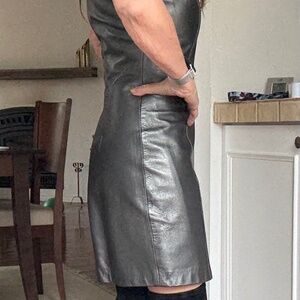 Above the knee beautiful dress fits snug size 4 Great Condition. I think I bought it at Browns...