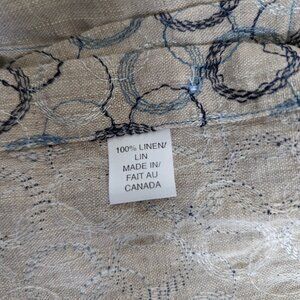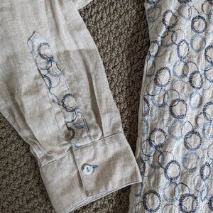 Stunning 100% raw linen button down shirt with an embroidered circles pattern in various shades of blue. It has pretty long sleeves that can be folded. Allows various styling options – please see photos for inspiration.