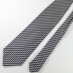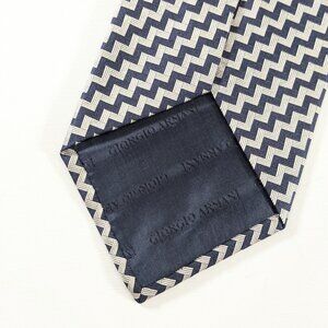 A classic geometric pattern neck tie by Georgio Armani in 100% silk, made in Italy. The fabric surface has a nice bit of detailing and the silvery tone looks metallic.
