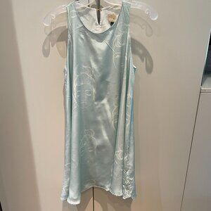 Selling a stunning retro looking 100% silk fully lined flowy dress by Canadian Designer Noemiah-Size Small. Made in Canada. Unique, limited edition silk fabric with subtle face design. Light Aquamarine colour with white drawing of face.