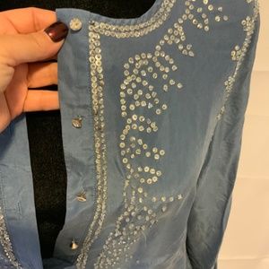 Gorgeous sequin tunic in 100% silk in a periwinkle blue color. Rhinestone button front
