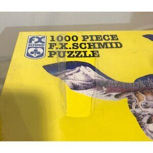 This F.X. Schmid 1000-piece jigsaw puzzle, titled "Pack Leader," features a wolf shape and a captivating wilderness scene. The puzzle measures 43" x 25.5", providing a challenging yet rewarding experience for puzzle enthusiasts.