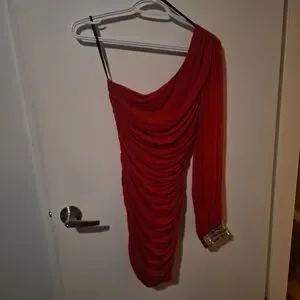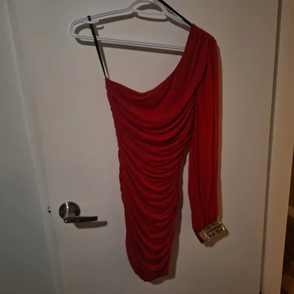 Stand out in this rose red one-shoulder dress by City Triangles. Features full-length ruching. Ideal for special occasions.