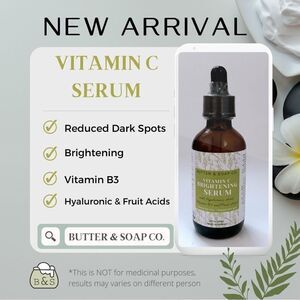 Butter & Soap Co. 100% Natural Vitamin C Serum for all skin type including sensitive skin, which performs as an exfoliant, anti-oxidant, and skin brightening agent with anti-aging properties. It contains 18%Vitamin C, 4% Hyaluronic Acid and more than 5%Vitamin B3.
