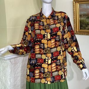 Beautiful vintage 100% silk button down shirt from J. McLaughlin for Sanyo. This beautiful shirt features a gorgeous and elegant print depicting a variety of travel cases. Beautiful colours, a black base with burgundy, yellows, green, blue, and tan.