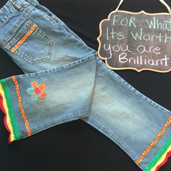 The adorable hippie flare bottom jeans by The Children's Place are in excellent condition. Crochet trim bell bottom flares with flower power patch these jeans are ready for the festival with mom.