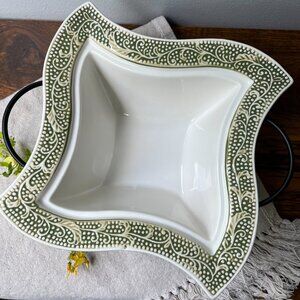 Description 🍮 Vintage porcelain baking dish on a metal wire stand Temptations by Tara. Stunning relief floral pattern on a green background, unusual shape. Oven, microwave, dishwasher safe.