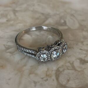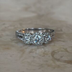 Absolutely stunning and timeless engagement ring featuring 3 genuine natural mined brilliant cut diamonds. In as new condition, just had it professionally rhodium plated.
