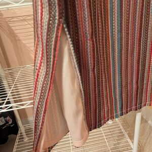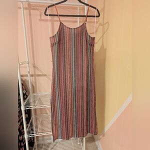 This stylish sleeveless dress features a vibrant striped pattern in multicolor shades. Perfect for any occasion, it offers a comfortable and chic look.