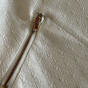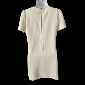 Form fitted little off white dress by Sweet Rain with puffy short sleeves and 2 generous side pockets with gold zippers, 2 zippers are for the same pocket giving the dress a unique Asymmetrical style. The back zippers up with a gold zipper as well.