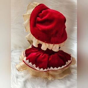 Charming porcelain doll in a red and cream outfit. Features a matching hat with lace details.