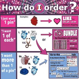 Want more info or to see more photos of the individual pins? Go to my closet and click on the Boutique tab to see all individual pin listings!