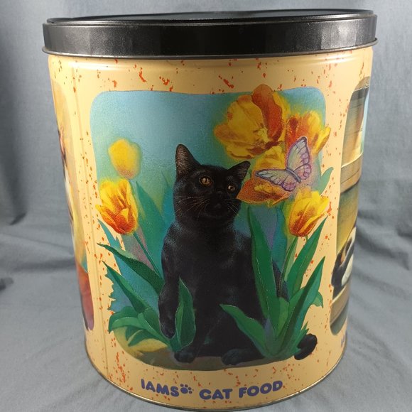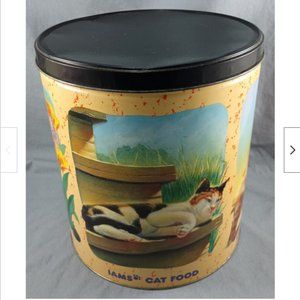 11" Tall Vtg 1994 IAMS Cat Food Storage Container 4 Seasons Tin Metal Canister with lid, empty.