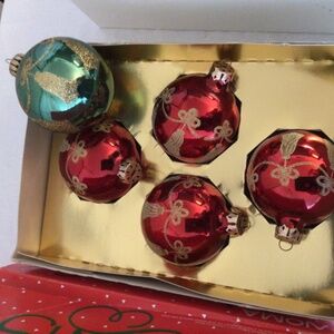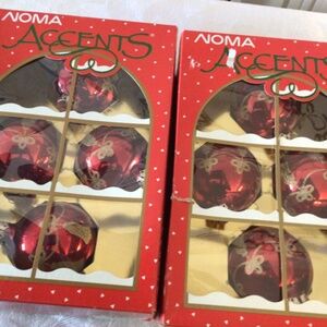 These ornaments are likely not vintage but have been around for many holidays. They are in good condition and the red ones are in the original boxes.