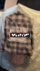 In a light blue , white, and red plaid, the shirt has button buttons at cuffs and down the front and two front pockets.. embellished with AC/DC back patch