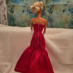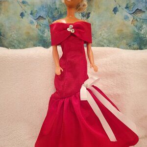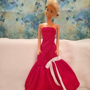 Long Satan formal fitted gown with a ruffle added to the bottom. This dress can be worn with or without a matching shawl. 1 dress with 2 different looks. This dress was sewn in a smoke free home. Doll not included.