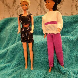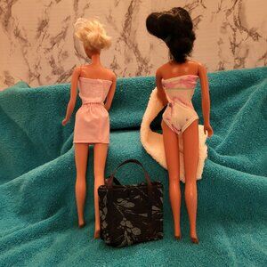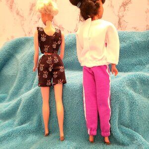 For the spots minded. Here you will find a swim suite and towel for Barbie, also a denim beach bag to carry accessories to the beach. After leaving the beach you could find Barbie dressed in this mini skirt and top. For the workout at the gym you will find a 2 piece short and top set. finally you have a 2 piece jogging suite. Sewn in a smoke free home. Dolls not included
