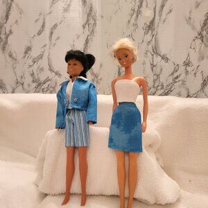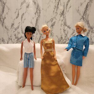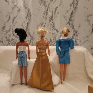 Weekend outfits for Barbie whether its shorts and top or skirt the tops jacket can be interchanged to give several different looks. Dress up the shorts with the jacket or a more casual look without same for the skirt. Also a long gown for the party she may have to go to . She will be ready for any occasion. Sewn in a smoke free home DOLLS NOT INCLUDED
