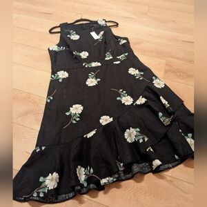 Chic black dress with white floral pattern. Sleeveless design with a ruffled hem.
