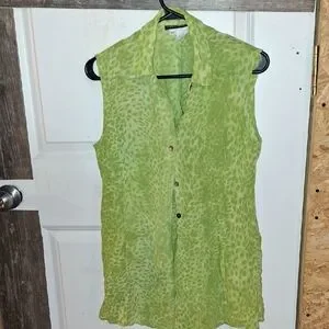 Add a pop of color to your wardrobe with this vibrant green sleeveless blouse. Featuring a chic leopard print, it's perfect for both casual and formal occasions.
