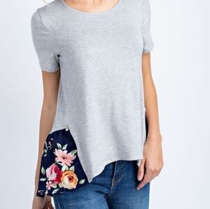 A short-sleeve solid rayon spandex top with a round neck, unbalanced high-low hem with floral woven fabric in the sides and back