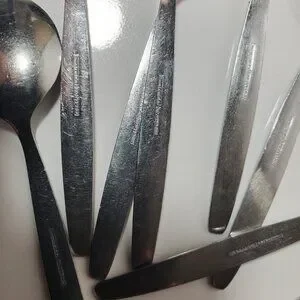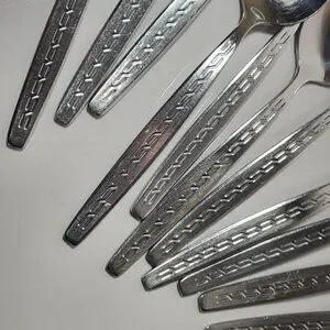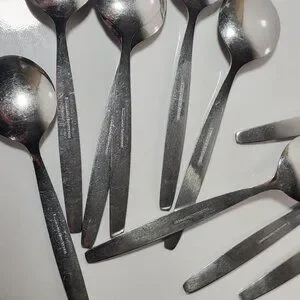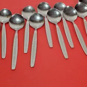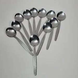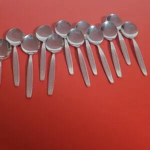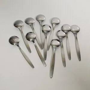 A set of 12 vintage Rosterfrei small spoons, likely intended as demitasse spoons but with a slightly rounder shape. Made of stainless steel, they show light surface marks consistent with past use, adding character while remaining fully functional.