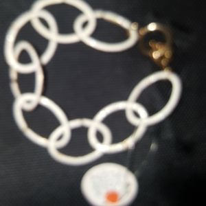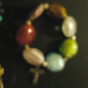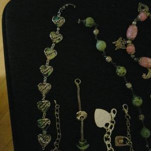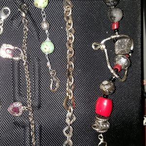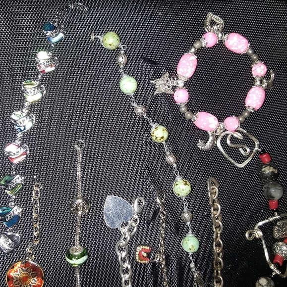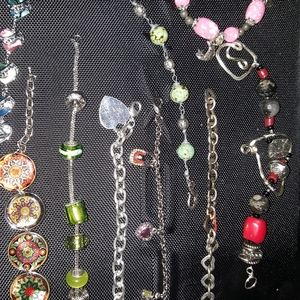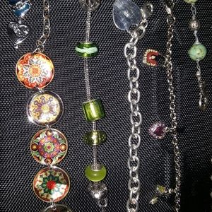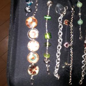 Silver braclets with colour stations and bright color glass beads. Alot of charm braclets