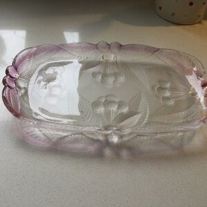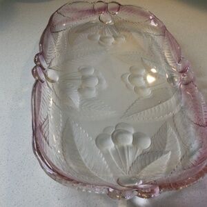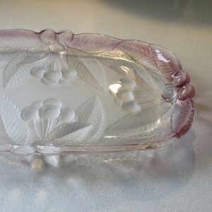 Very pretty serving dish. Size is 12x7, clear glass with lovely pink ombré edging. Inside is embellished with cherry bunches, very elegant serving dish. Excellent condition, no cracks or chips.