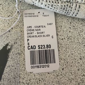 This cream coloured mini skirt by FOREVER 21 has a Navaho style pattern in black and shiny silver. It is brand new with tags and zippers up the back. There is a small barely noticeable snag, see pics.