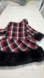 Stylish plaid coat with black faux fur trim. Features red, black, and white colors.