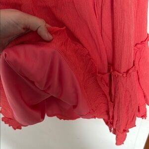 This elegant red ruffled dress is perfect for any occasion. Its vibrant color and stylish design make it a must-have in your wardrobe. Ptp stretched 15” Length top of shoulder to bottom 31” Waist 12” stretched to 14.5” Can be worn on the shoulders with short sleeves or off the shoulders.